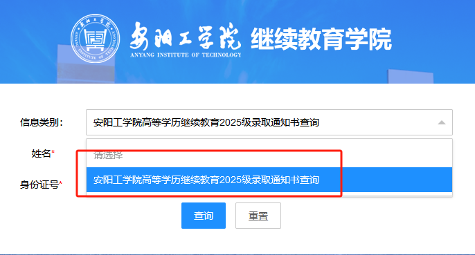 2、信息类别选择——“williamhill中国官网入口高等学历继续教育2025级录取通知书查询”。